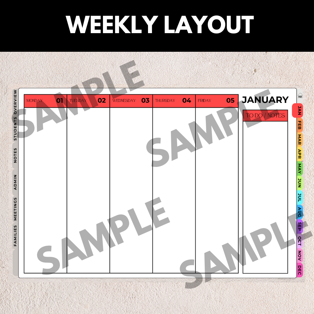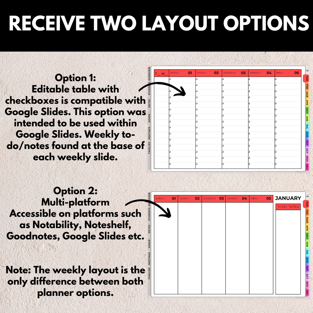 💡 Personalisation Options: Beyond all that your 2024 Teacher Planner has to offer, you can further tailor your planner with 12 additional customisable sections, ensuring your planner aligns perfectly with your unique teaching and student needs. Further than this, your purchase includes 2 different weekly layout options for your convenience.