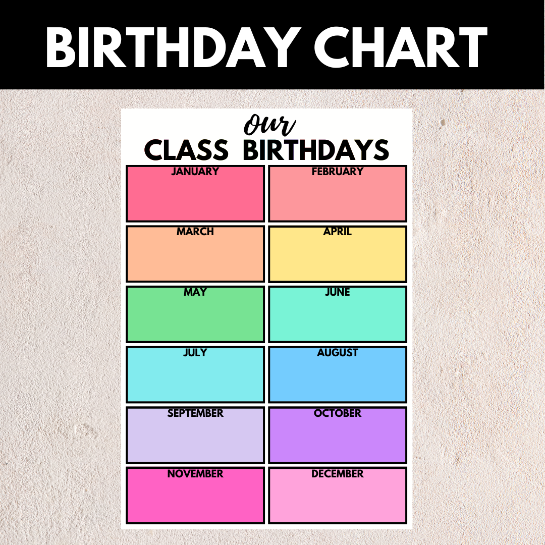 Use this birthday chart display in your classroom so that students can see their birthdays up on the wall and during back-to-school time it will help everyone get to know each other. The display is easy to print and has text boxes ready to go for you to add in any names and dates.