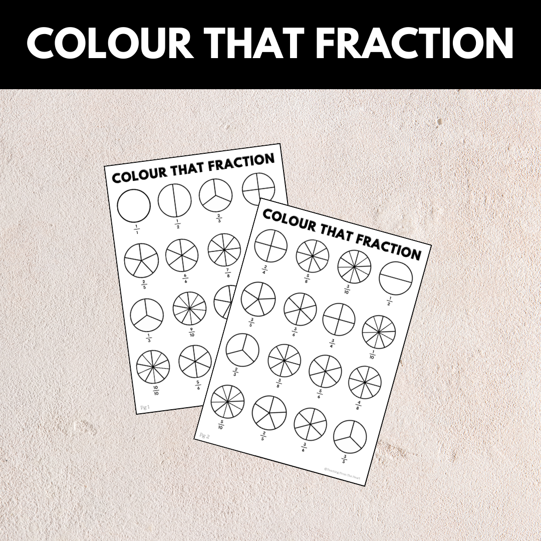 What is included: 2 black and white worksheets with 16 different fractions to colour in on each page.