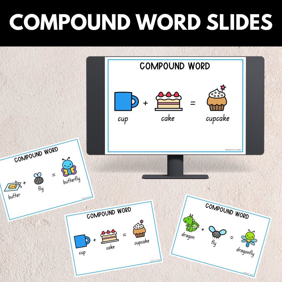 Foster vocabulary development and critical thinking with 60 sets of compound word slides.