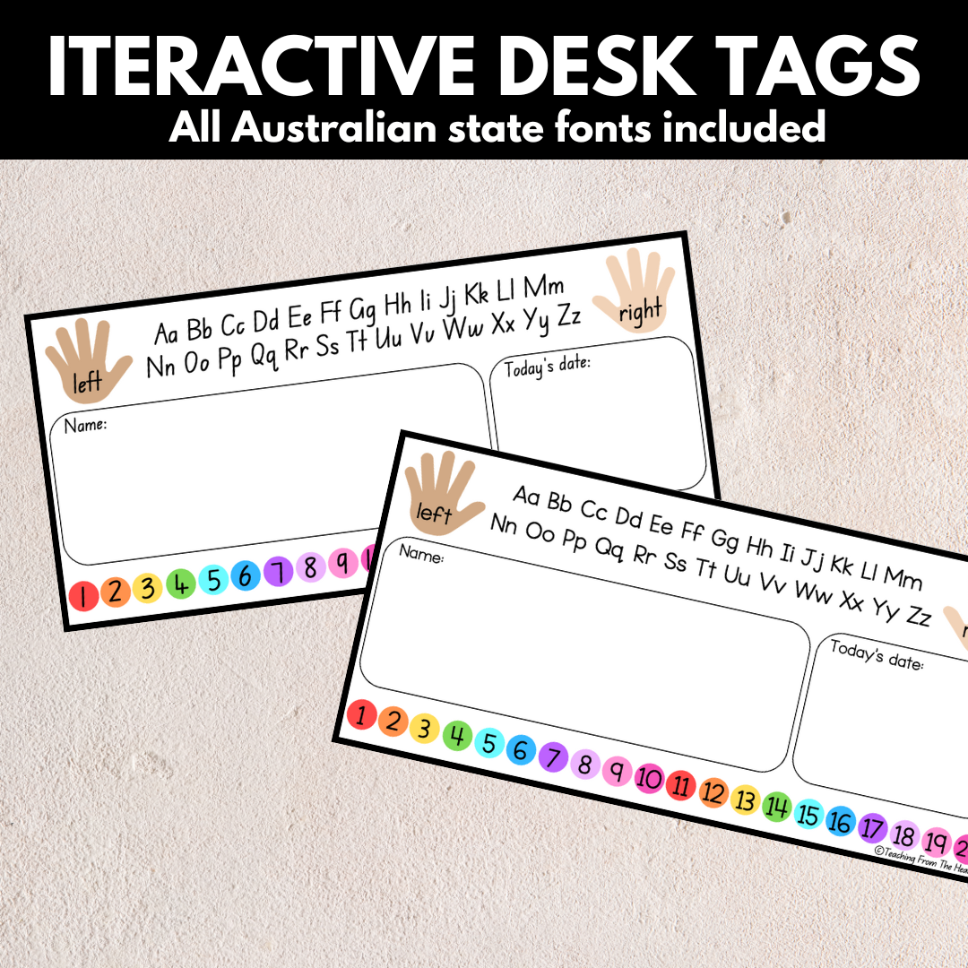 Elevate your teaching environment with these practical and visually appealing desk tags, making learning both fun and functional! Meticulously designed, this resource includes the alphabet, numbers 1 to 20, and a left and right display – all essential for early education. What sets our desk tags apart is the interactive element, featuring a dedicated space for students to write their name and the date each day using a whiteboard marker. Simply laminate so the whitebaord marker wipes off easily. This not only promotes daily engagement but also reinforces handwriting skills. Transform your primary school classroom into a dynamic learning space with our versatile and engaging desk tags!
