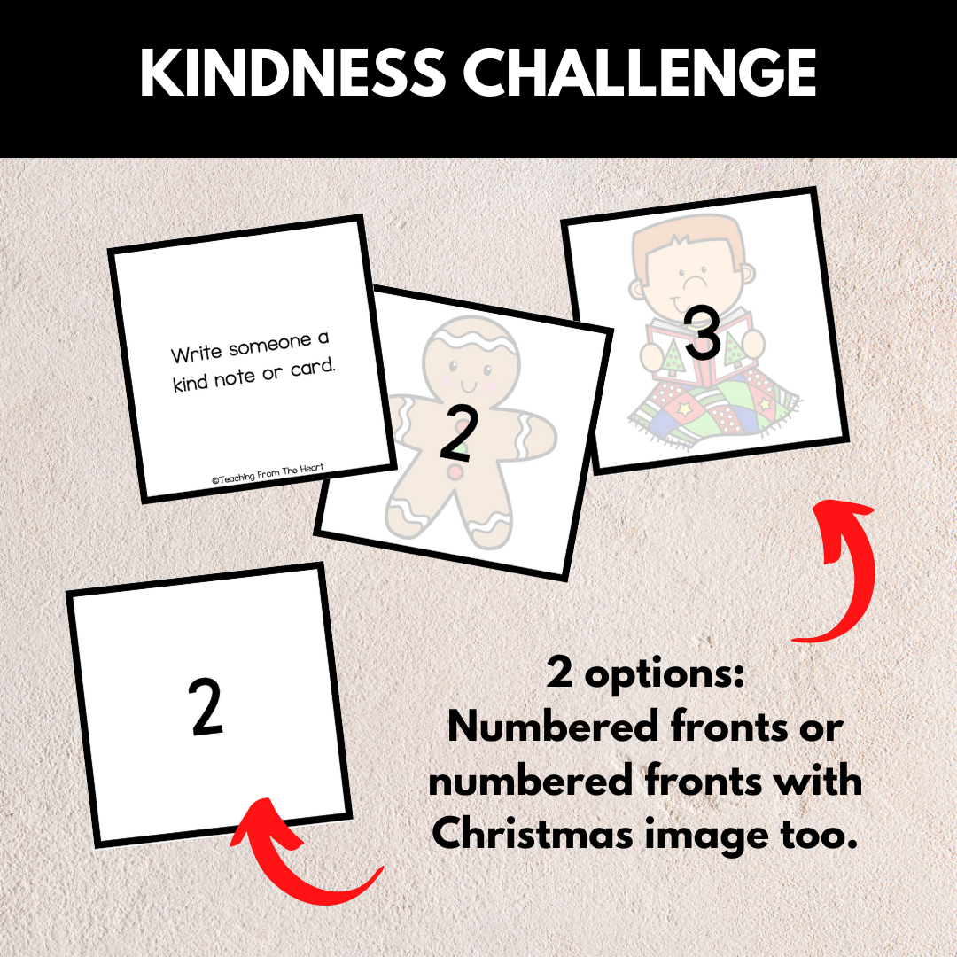 What is included: 30 squares that can be printed double sided for a number 1-30 on the front and a kindness challenge on the back. There are 2 options for the front of each slip; either just numbers, or numbers with a Christmas image on each too (this can be used as a Christmas advent calendar).