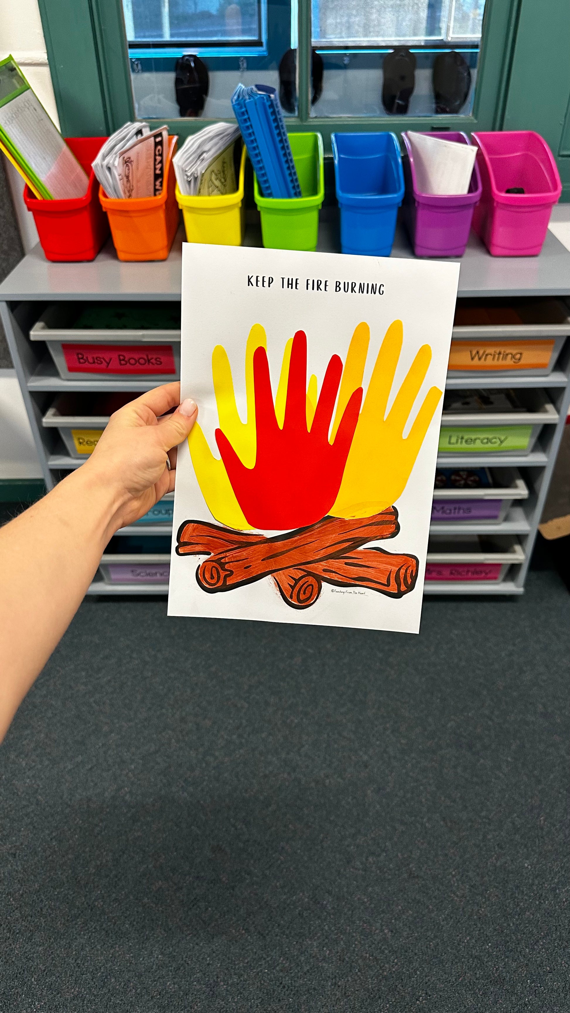 What is included: Template with different themed titles like "Keep The Fire Burning" and "Together We Can Keep The Fire Burning". Each template has black/white wood outline towards the bottom for students to colour in and paint or cut and glue handprints onto to represent flames.