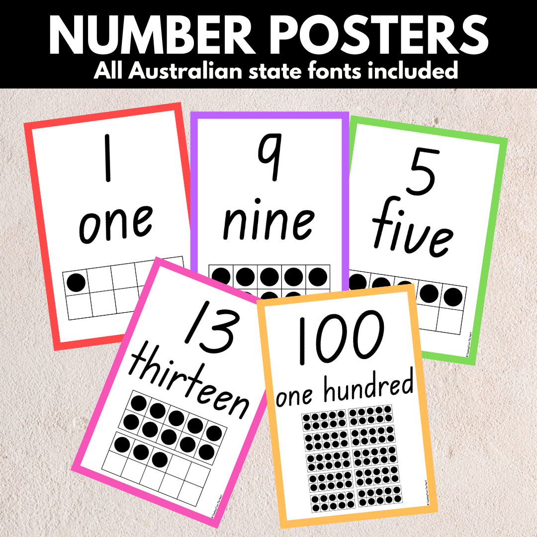 What is included: A4 Number posters with the digit, word and 10 frame visual for each poster. Numbers: 1-20, 30, 40, 50, 60, 70, 80, 90 and 100. This resource is aligned with all Australian state fonts