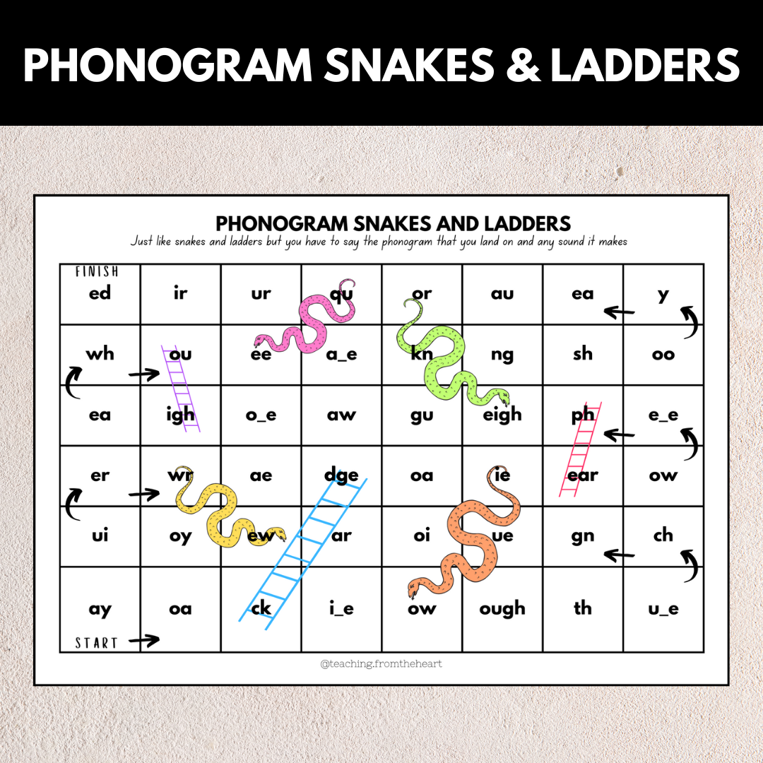 Practice over 40 Phonograms with this phonogram twist on the classic game of Snakes and Ladders. Students have to say each phonogram that they land on and any sound it makes