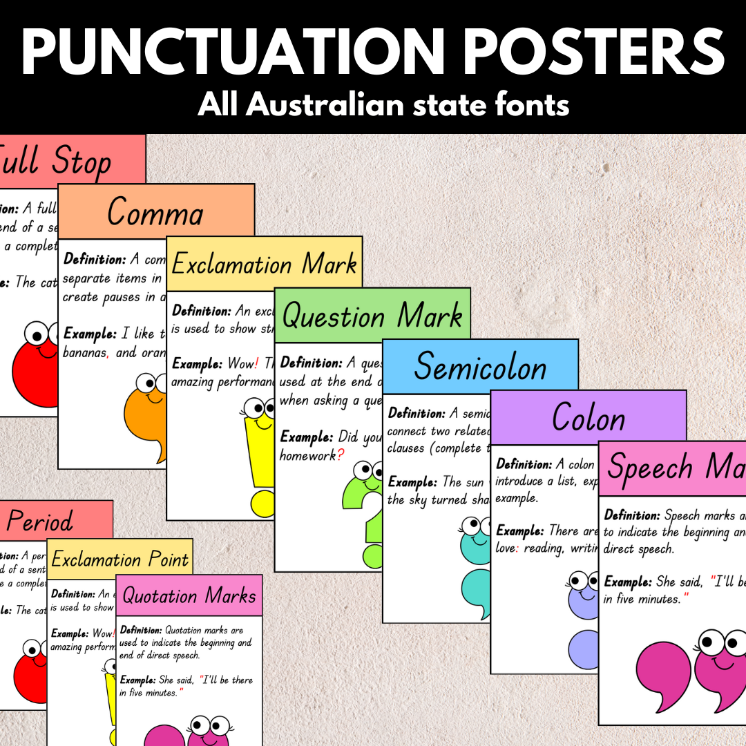 Each poster features a clear definition, example, and a beautifully crafted image of essential elements of punctuation. From full stops to quotation marks, these posters are designed in all Australian state fonts, ensuring consistency with curriculum standards. The rainbow colour scheme with matching clipart adds a pop of excitement, making learning punctuation a visually engaging experience for students.