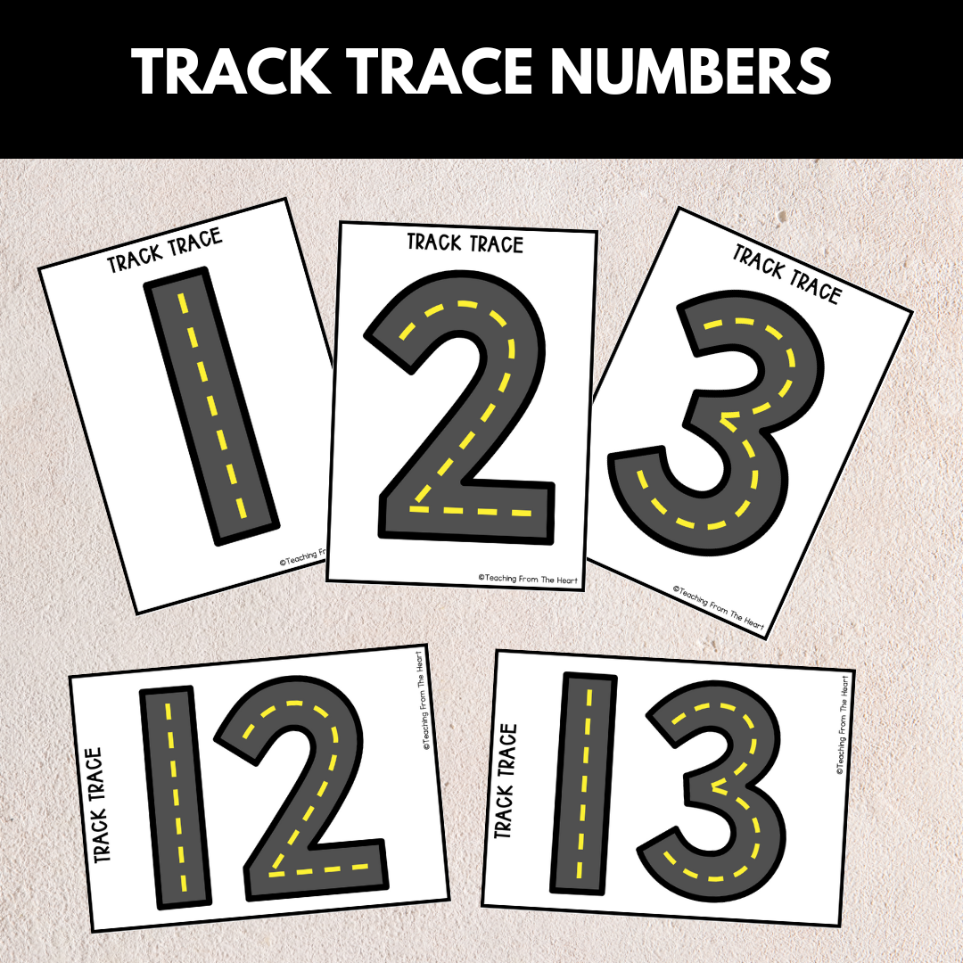 Laminate these race track-themed number cards. Students trace with toy cars, enhancing number formation and fine motor skills.
